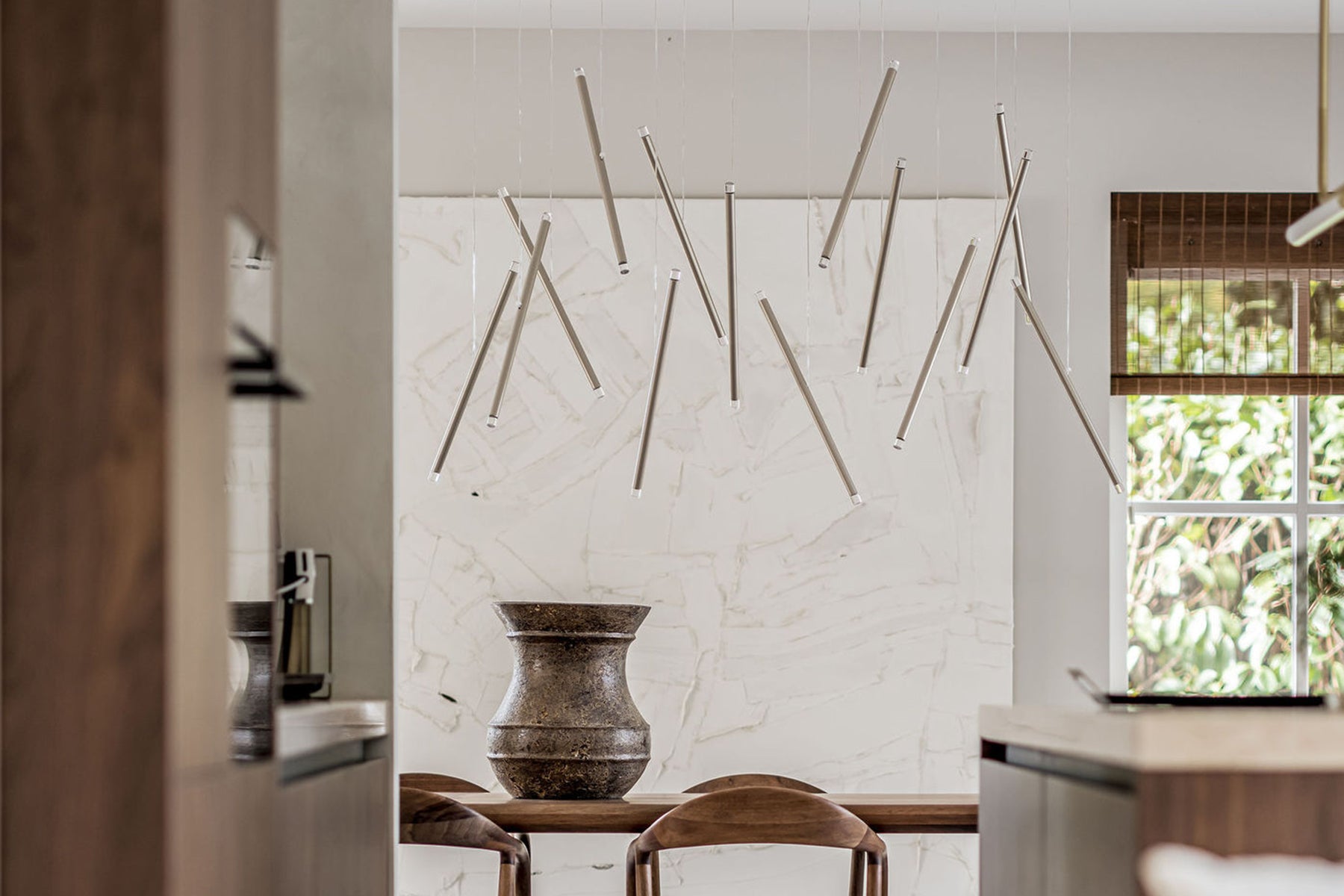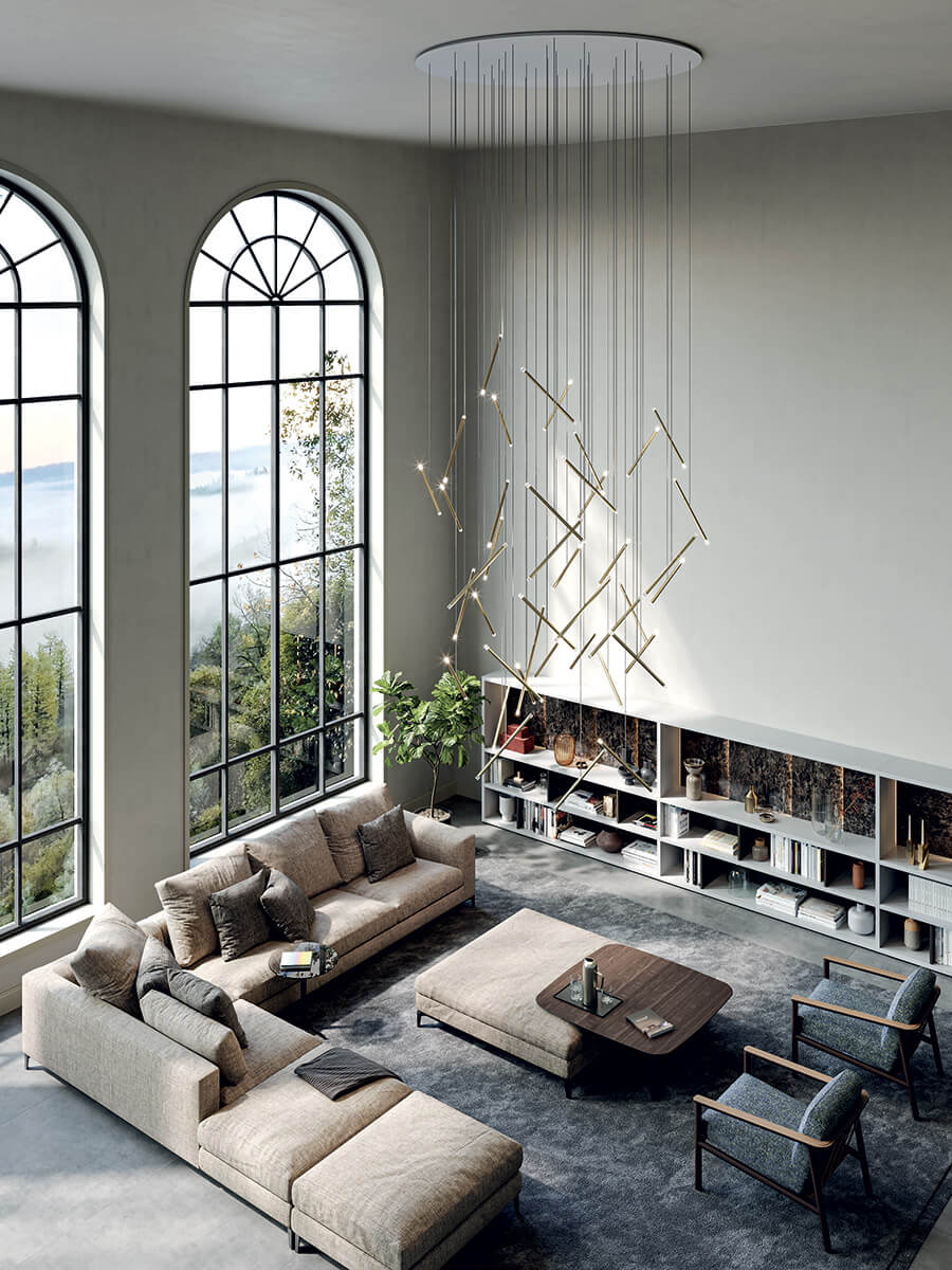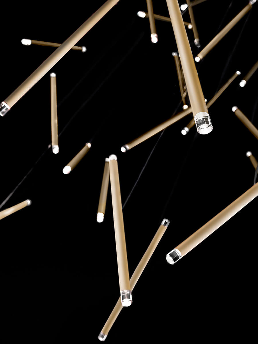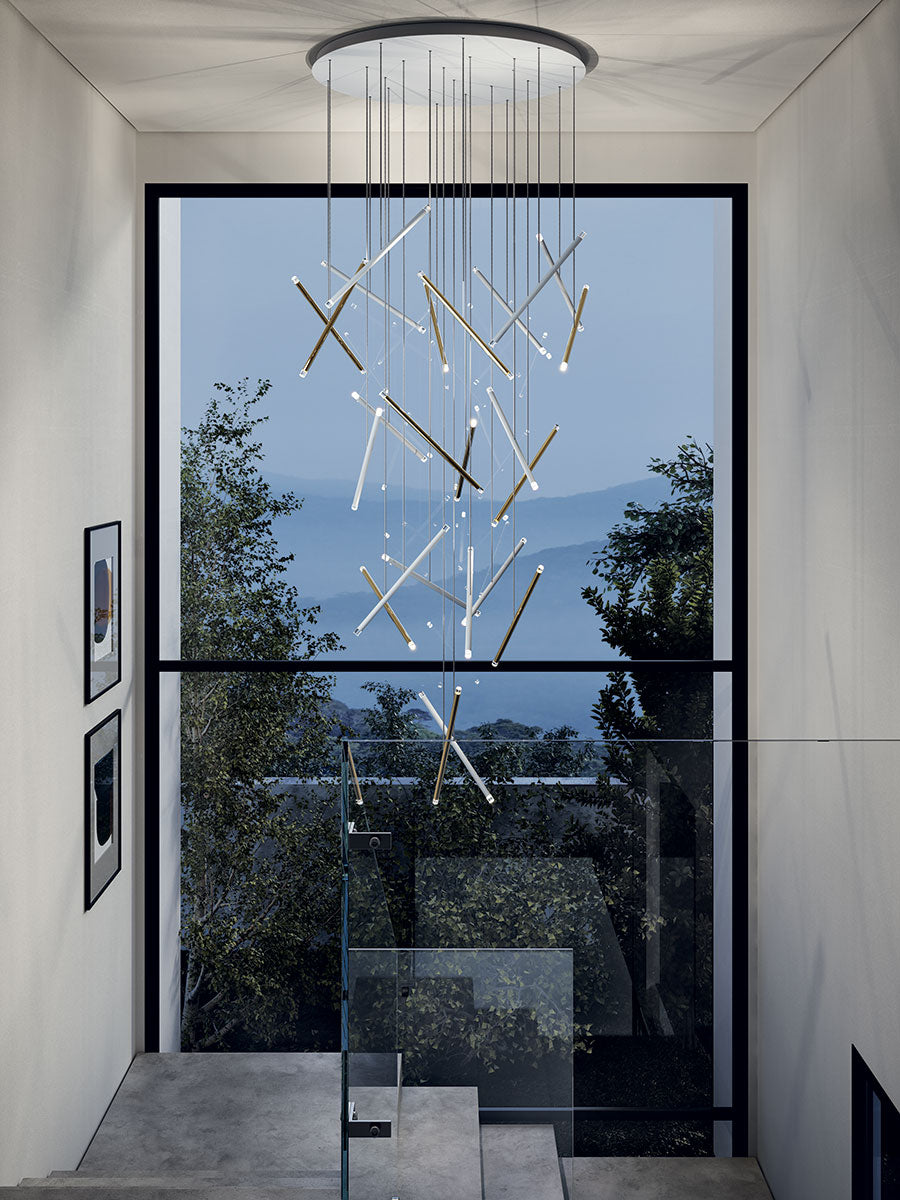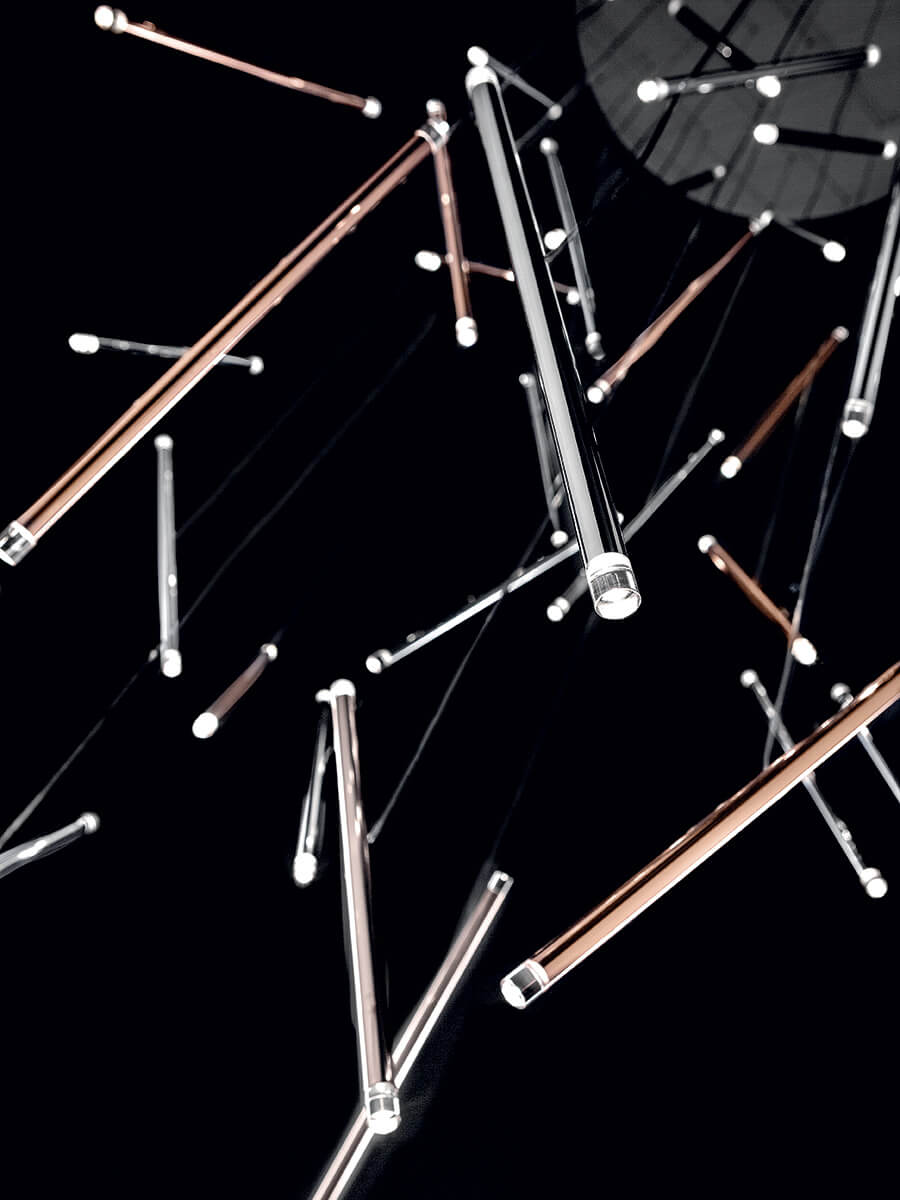 Suspended as if balanced on the power cord, A-Tube Nano Duo appears to float in the space, mindless of the force of gravity. Its essential form, 50 cm long, lends itself to enchanting compositions thanks to its six finishes, either polished (chrome, rose gold and gold) or matte (black and champagne).
