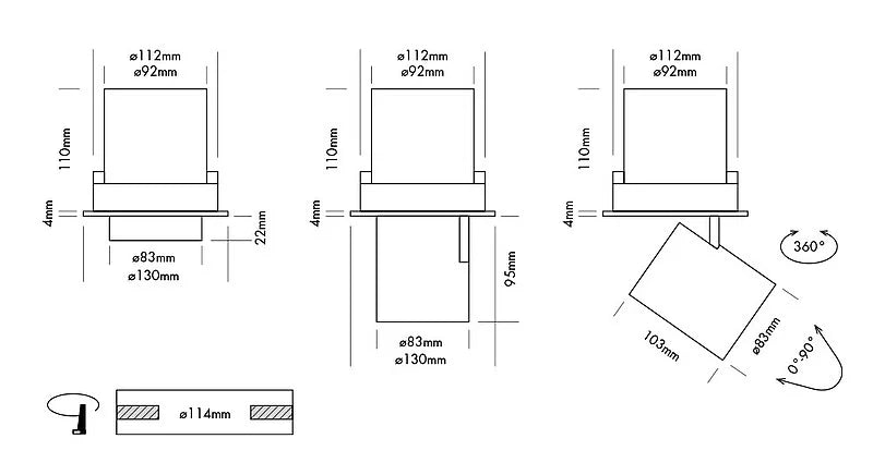 - Diameter: 83 mm ø (aperture) x 130 ø (with trim)