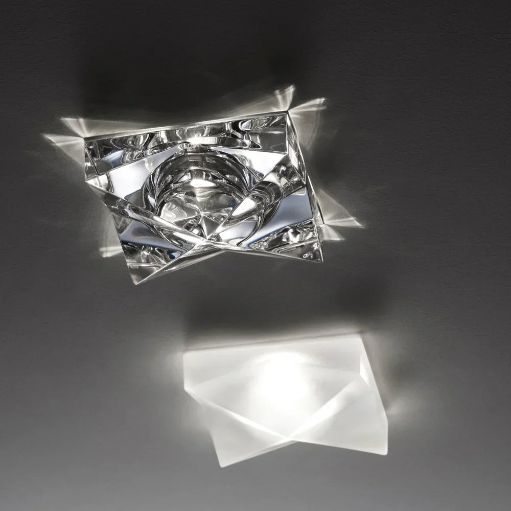 Semi-recessed clear glass downlight with a covered diffuser in a square shape with a pyramid shape that has raised edges to the sides for extra lighting effect. IP44 rated for use in bathrooms though pretty enough for most any room. Great for adding a pretty touch to ceilings because the glass creates a pretty glow onto the ceiling thanks to the glass. Works well in kitchens, utility rooms, living rooms, bedrooms, bathrooms, home gyms, hallways, etc. Uses a GU10 bulb, not included.