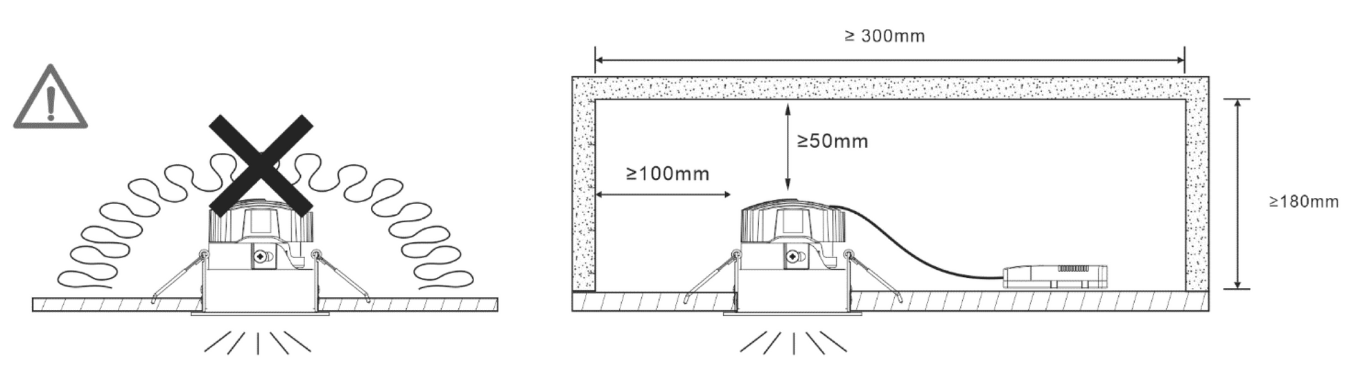 - Minimum 50 mm height clearance from top of light and 100 mm to the sides