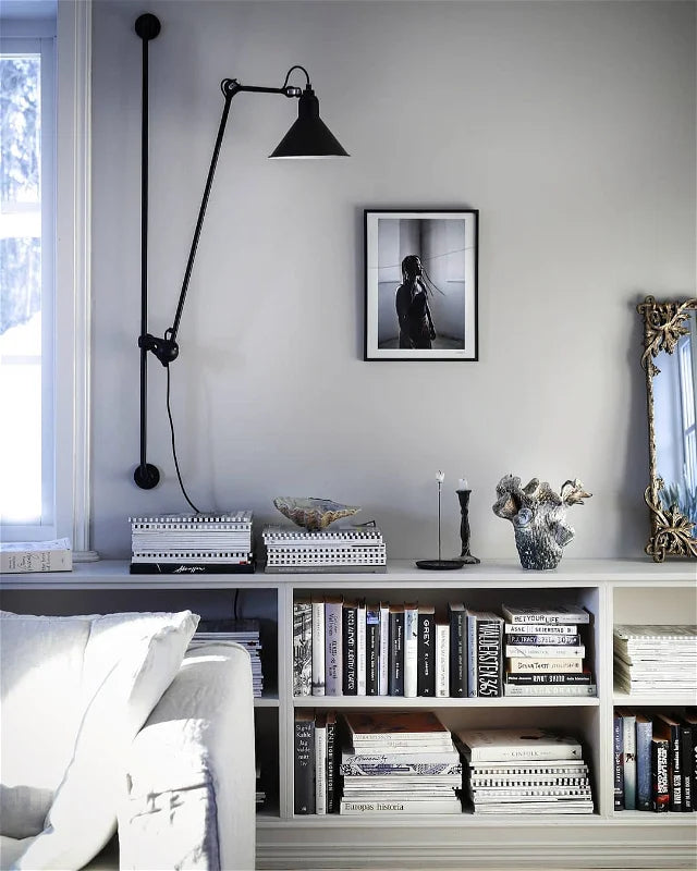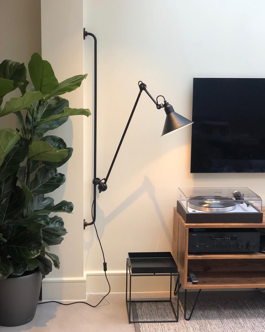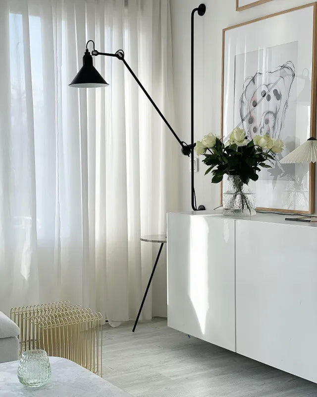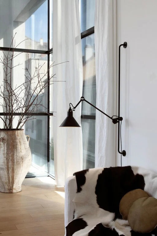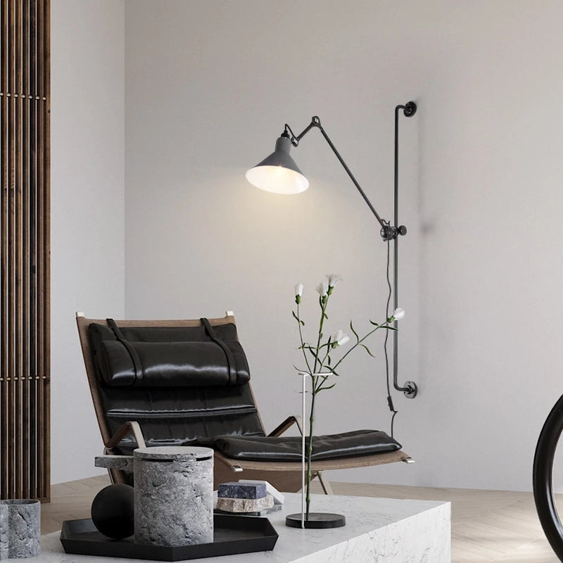Design icon, this family of lights has been in production since 1921. The joints work without any screws or welding - built to last. Elegant, chic, stylish and functional wall light on a bracket with a conical shade. The horizontal arm slides up and down the long vertical bracket [over a metre long], as well as extends forwards, sideways and downwards. The shade is also adjustable. Fantastic light for many uses - from bedside reading to lounges. Anywhere you want the ultimately flexible light. It comes with a plug and on/off switch on the cord.