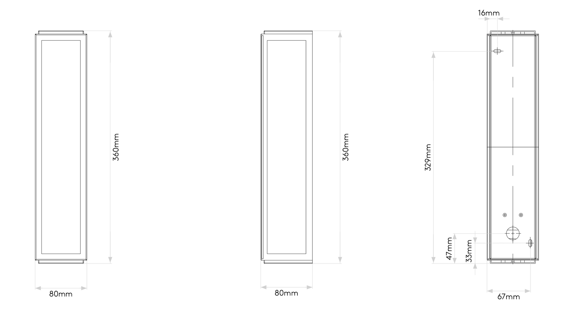 - Body: 360 mm H x 80 mm W x 80 mm P