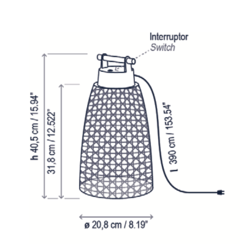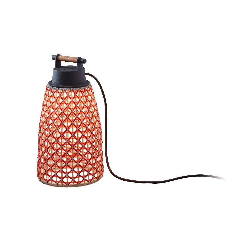 Cone-shaped table lamp that creates instant atmosphere which you can use indoors or outside and easily move from place to place thanks to the handsome, high-quality handle. The rattan shade makes it cozy and welcoming, and glows beautifully when lit. LED. 2700K. IP54. Plugs In. Touch Dim.