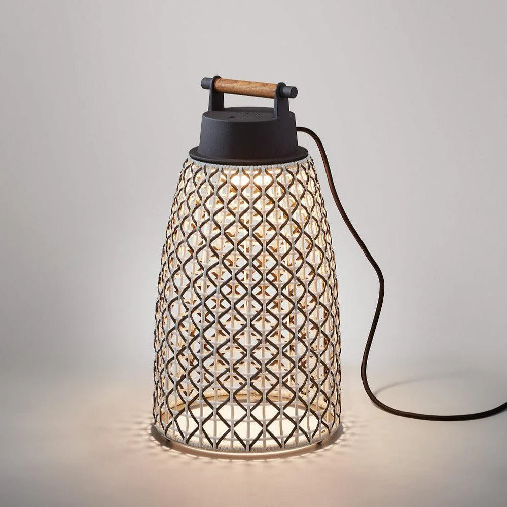 Cone-shaped table lamp that creates instant atmosphere which you can use indoors or outside and easily move from place to place thanks to the handsome, high-quality handle. The rattan shade makes it cozy and welcoming, and glows beautifully when lit. LED. 2700K. IP54. Plugs In. Touch Dim.