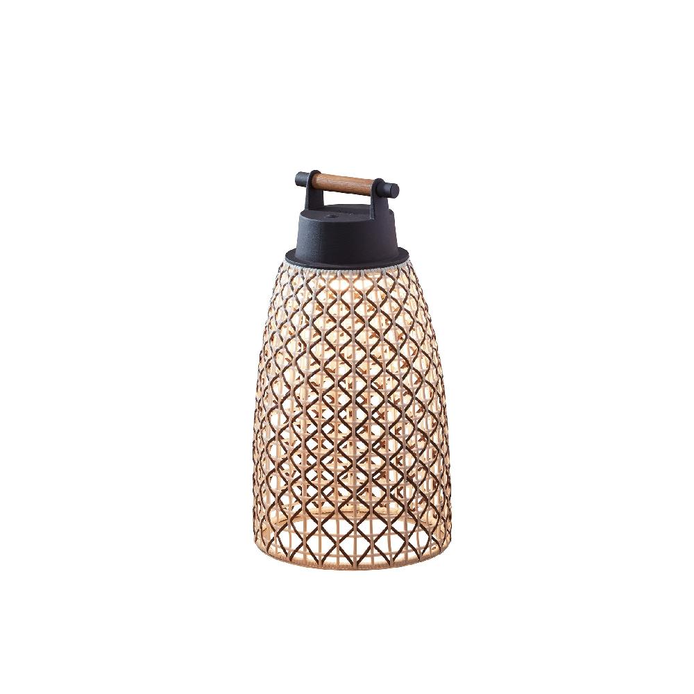Cone-shaped battery-operated portable table lamp that creates instant atmosphere which you can use indoors or outside (or create a beautiful mood in your bathroom). The rattan shade makes it cozy and welcoming, and glows beautifully when lit. Rechargeable. LED. 2700K. IP54. Wireless. Touch Dim.