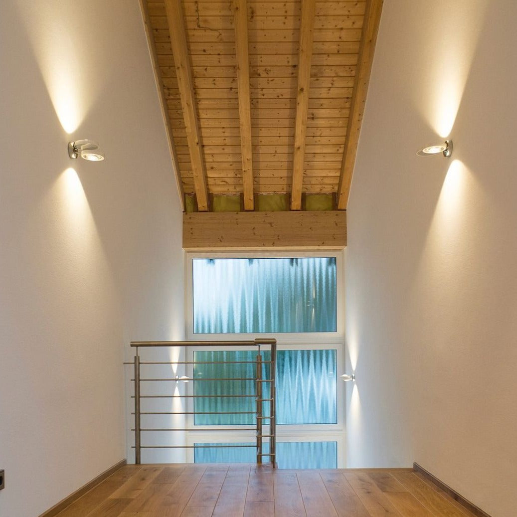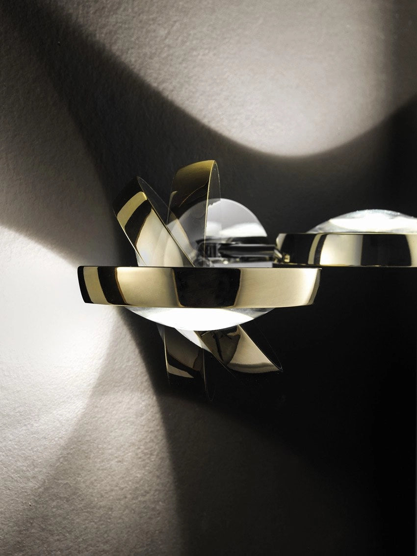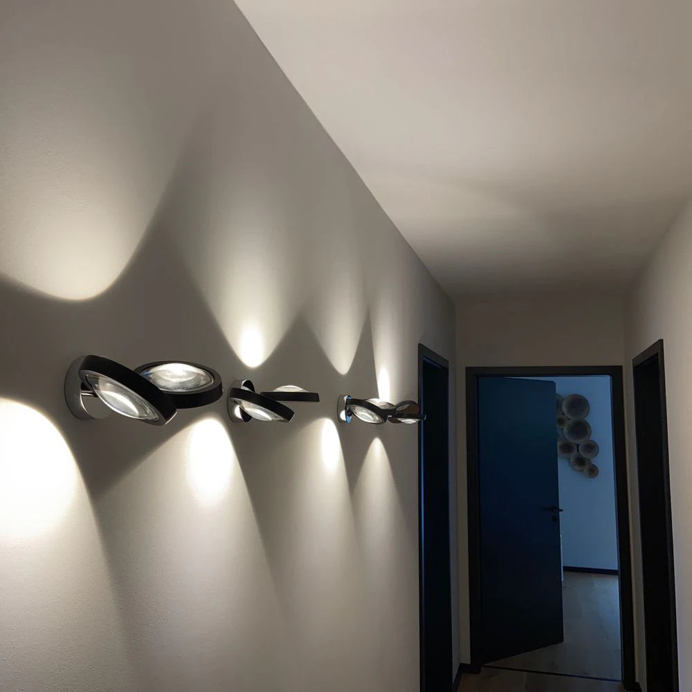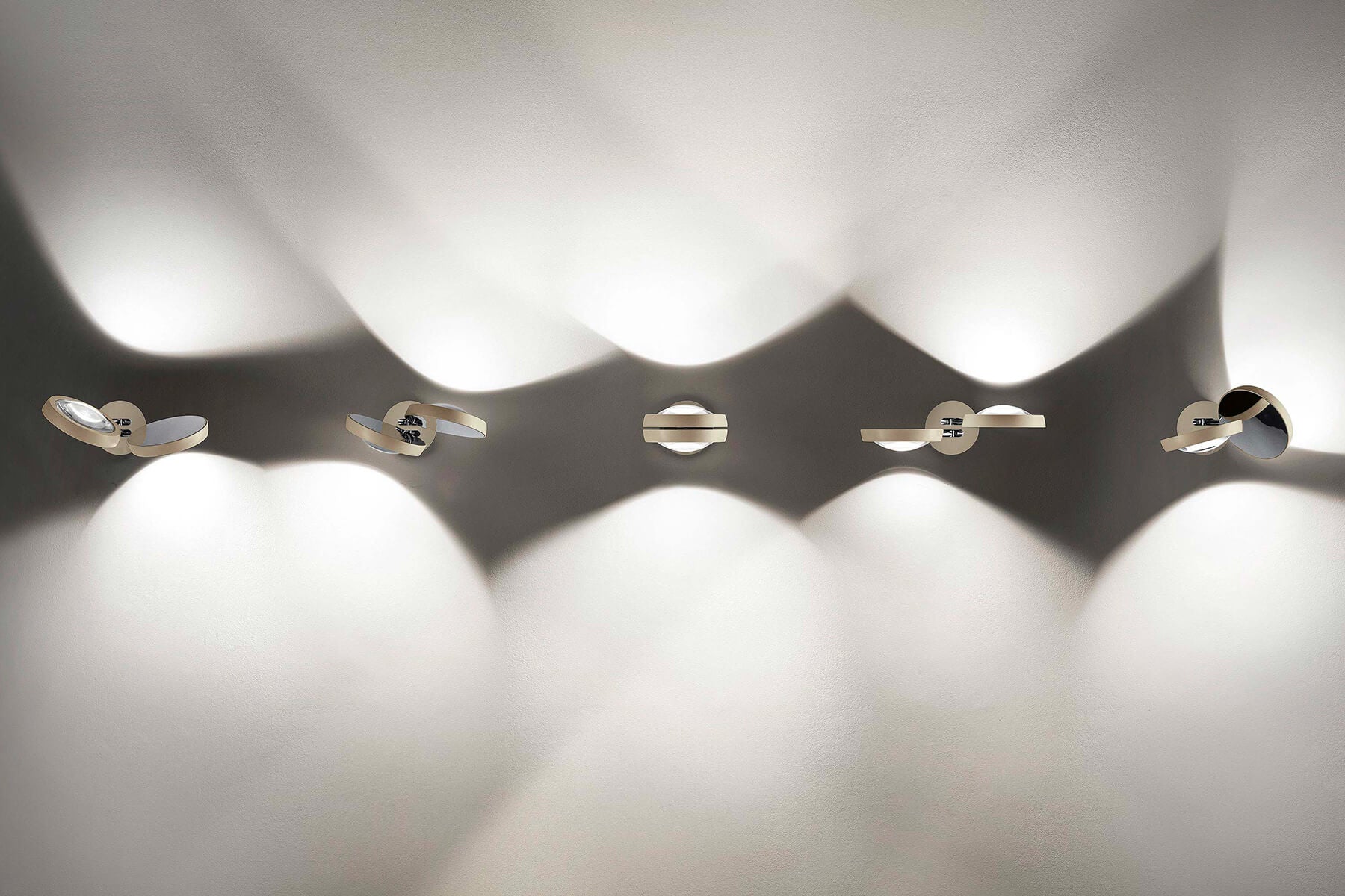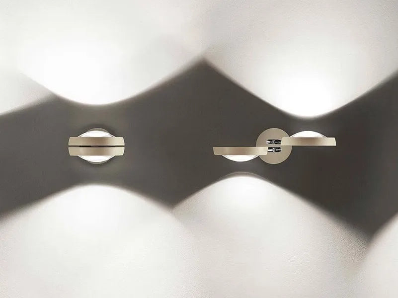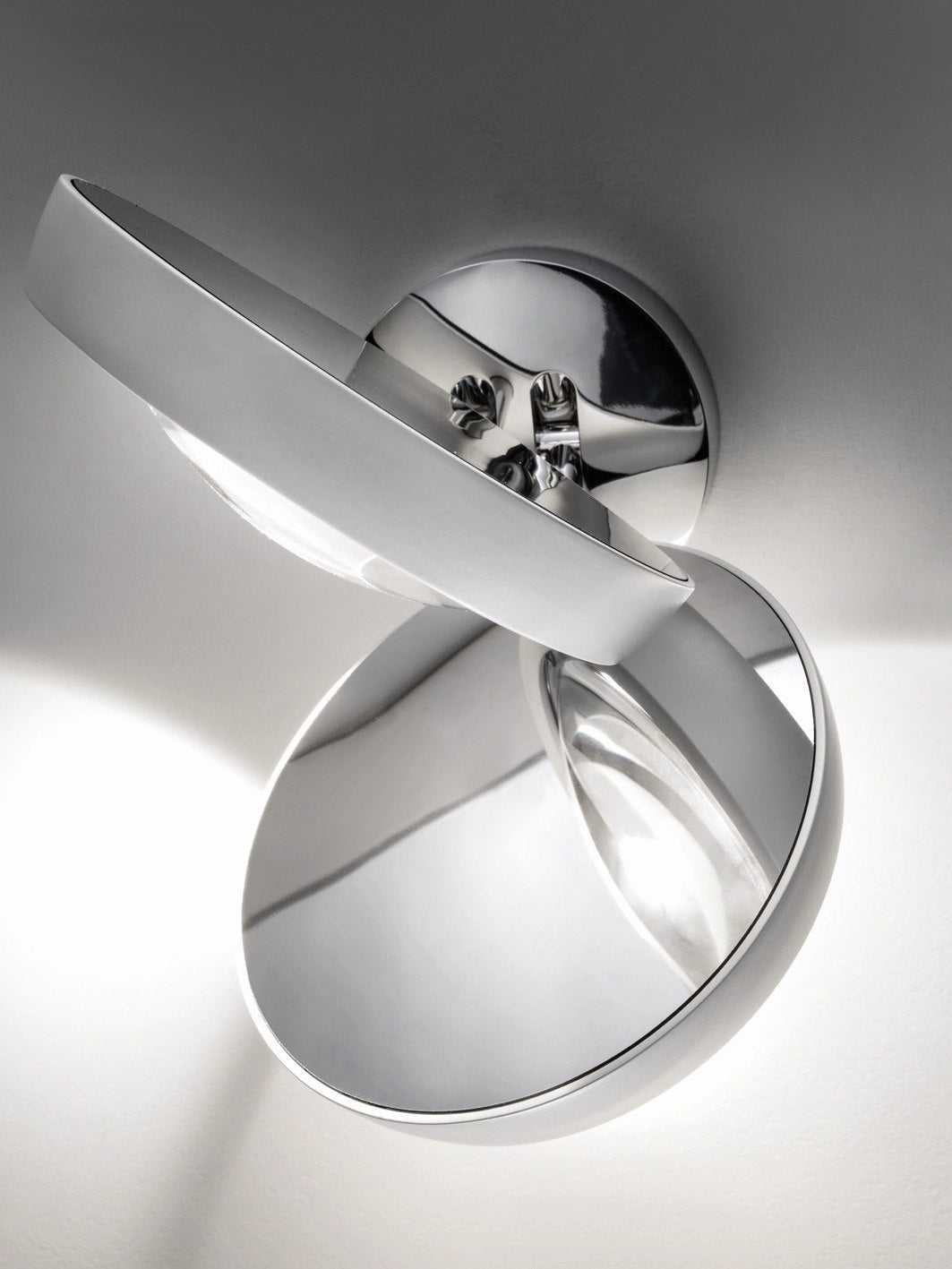 The wall version of Nautilus consists in a wall mount with two movable arms that support the light fixture with a diameter of 13 cm, each with a convex lens housing a 12W LED light. The lamp can be used as a single element to project direct light symmetrically in opposing directions. Alternatively, the mobility of the diffusers, which can be separated with an opening of up to 90° and rotated by 320°, allows the two light beams to be managed individually at will. A highly versatile and practical appliqué, which can be harmoniously inserted into any type of space also thanks to the broad range of available finishes.