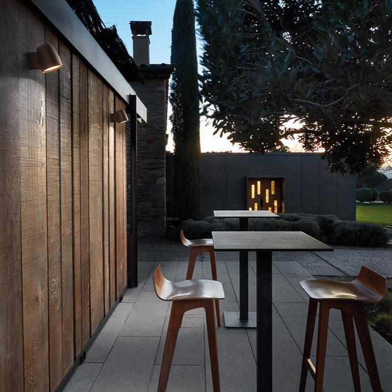 Ergonomic cone-shaped adjustable wall light that has a dimmable thumbswitch at the top of the shade with IP54 rating for use indoors and outdoors, including bathrooms. The light source is shielded within the shade, providing downwards, wide glare-free lighting well dispersed thanks to the internal polycarbonate diffuser. LED. 2700K. IP54. Triac Dim.