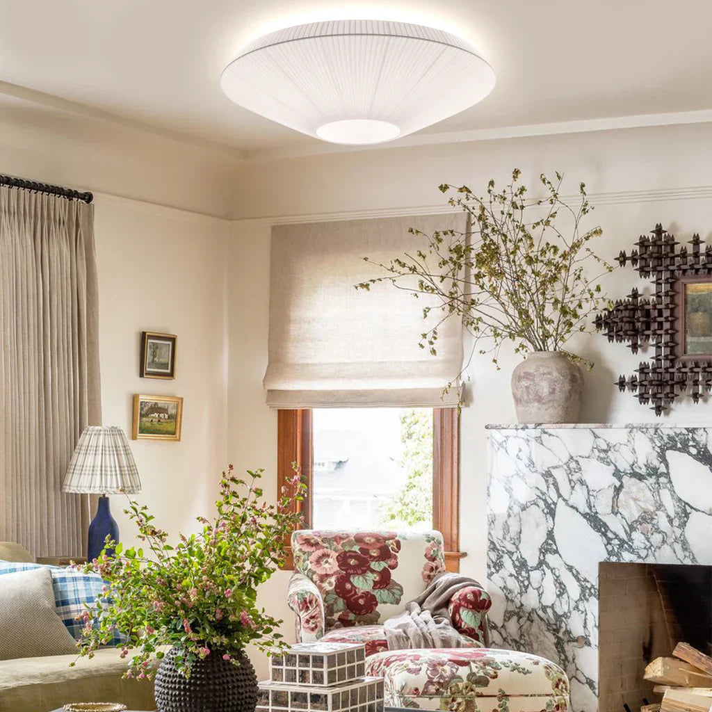 Large semi-flush ceiling light made with handwoven ribbons and a polycarbonate diffuser on the bottom to cover the bulbs from sight with a choice of 2 stem lengths (same price). Perfect for when you want a feature light but not hang a pendant. Works well in spaces that require a warm, all-around timeless light that looks good when viewed from the bottom.