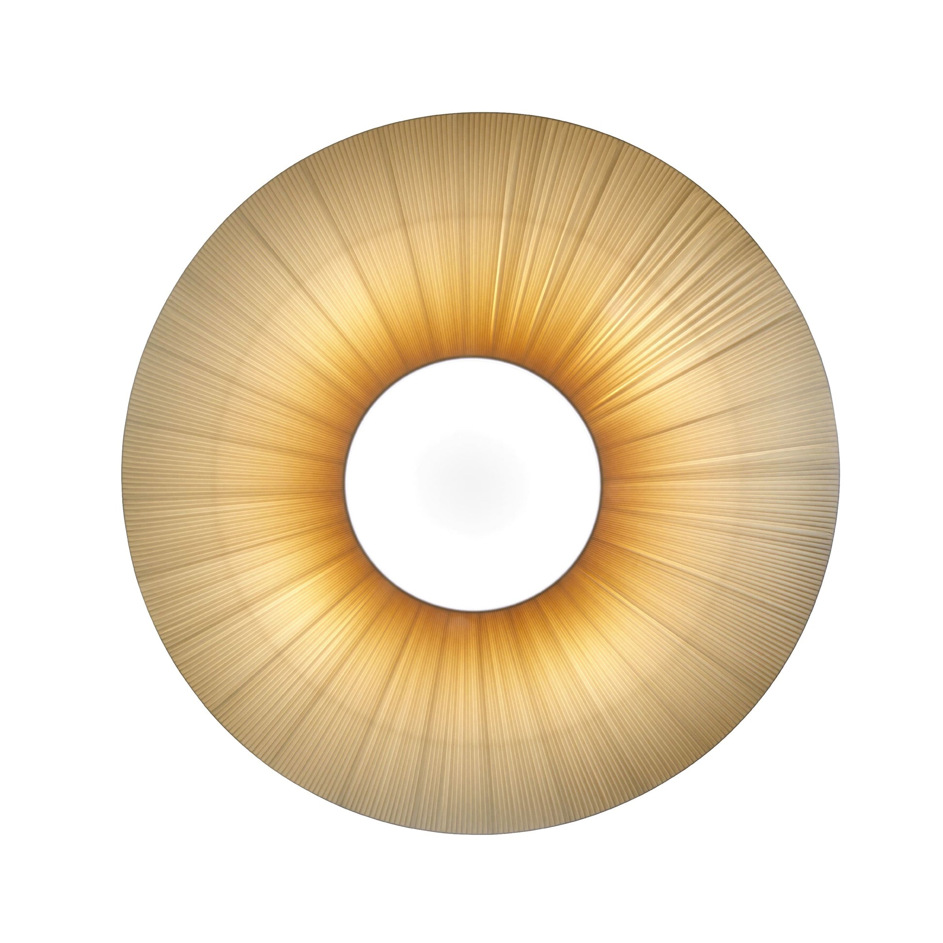 Large semi-flush ceiling light made with handwoven ribbons and a polycarbonate diffuser on the bottom to cover the bulbs from sight with a choice of 2 stem lengths (same price). Perfect for when you want a feature light but not hang a pendant. Works well in spaces that require a warm, all-around timeless light that looks good when viewed from the bottom.