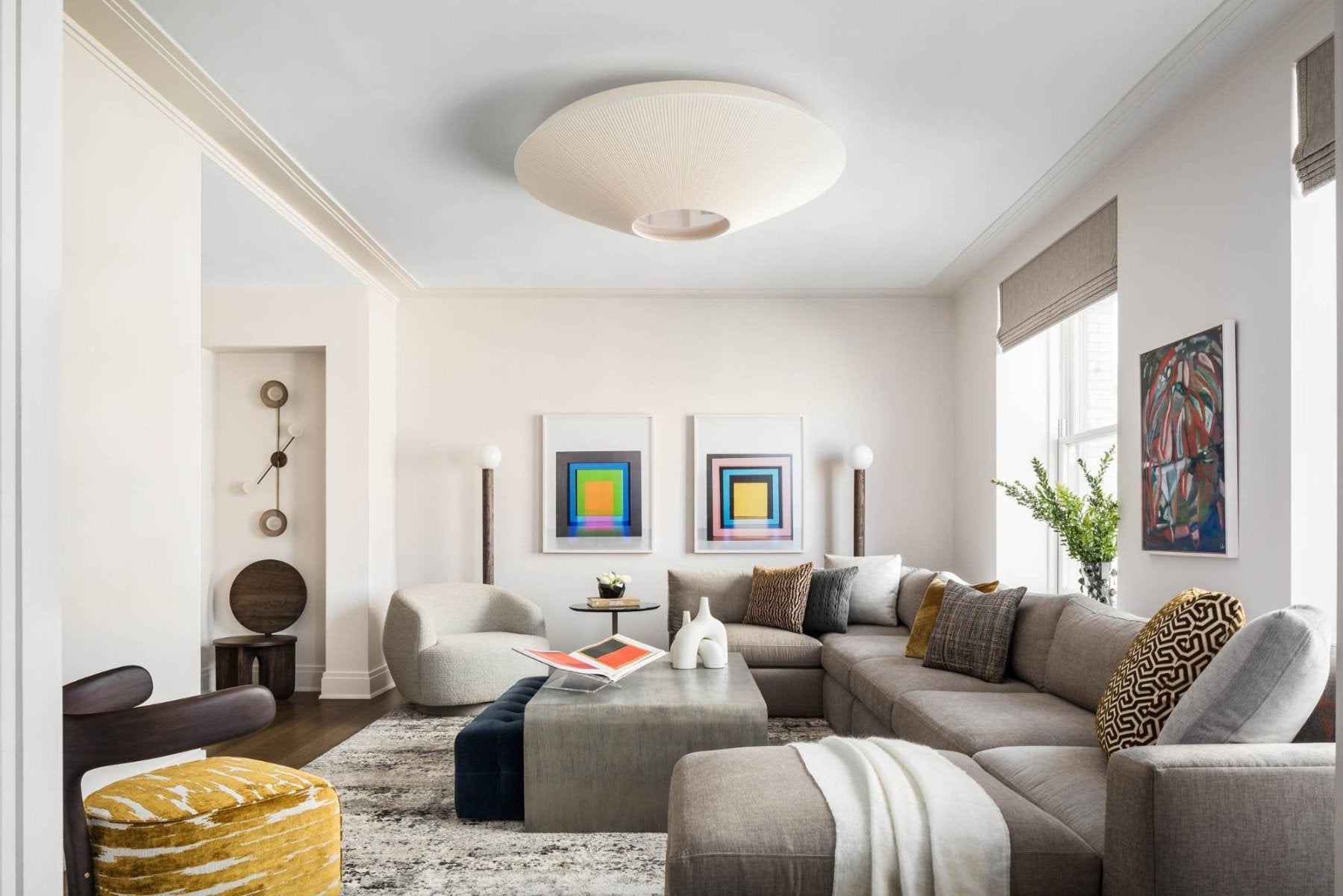 Large semi-flush ceiling light made with handwoven ribbons and a polycarbonate diffuser on the bottom to cover the bulbs from sight with a choice of 2 stem lengths (same price). Perfect for when you want a feature light but not hang a pendant. Works well in spaces that require a warm, all-around timeless light that looks good when viewed from the bottom.