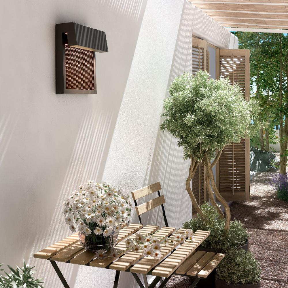 Framed art work as much as a wall light. The square shape has a centre of synthetic (long lasting) woven fibres, capturing the light which cascades down the front, providing texture and interest as well as useful downwards light. LED. 2700K. IP66. Triac Dim.