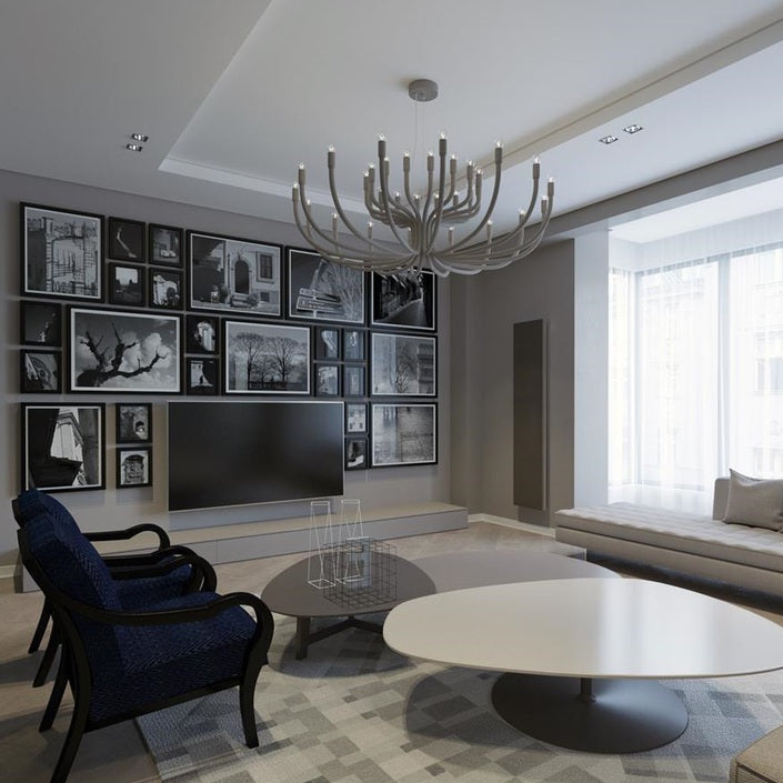 The classic design of antique candle holders is proposed in a minimalist and extremely contemporary key by a chandelier with 8 or 16 lacquered aluminium arms. It recalls a timeless elegance with its baroque volutes, available in white or black.