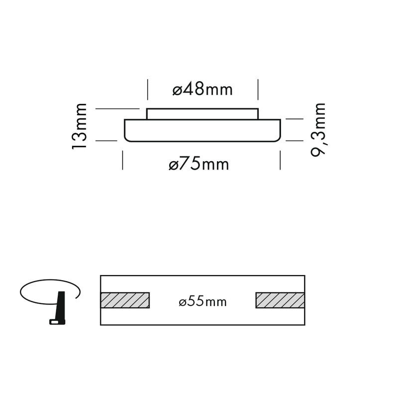 - 75 mm ø x 9.3 mm H x 13 mm OAH
