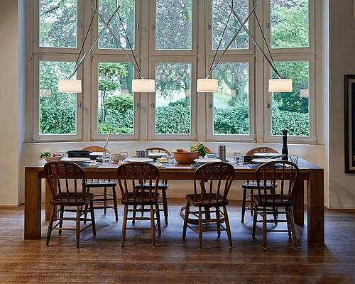 The structure of this elegant suspended lamp is straightforward and transparent, without seeming sober, and highlights its function. To alter the distance between the two shades, the arms of the lamp are simply pulled apart and thus adapted to the relevant needs. Regardless of the angle of the arms the shades stay horizontal at all times. If TWIN is fully expanded a space opens up between the two shades that can be put to optimum use, for example for large vases and bouquets on the table top.