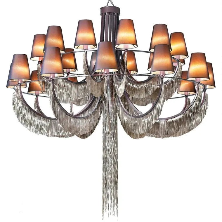 Haughty and exuberant, like a Charleston dancer, this is Vanitosa, dressed in shining fringes shimmer along the curvaceous body, daring you to touch it. A peculiarity of this collection is its great range of available lampshades, along with a choice of gold, white nickel or black nickel chain fringe and body. Choose matching metals or mix for more drama.