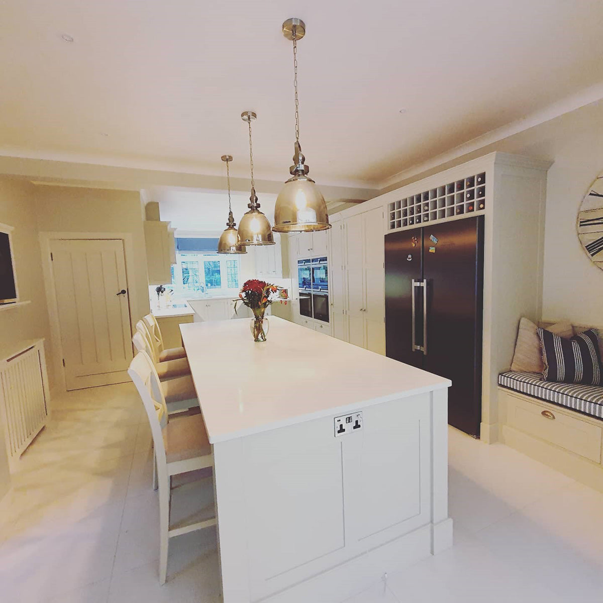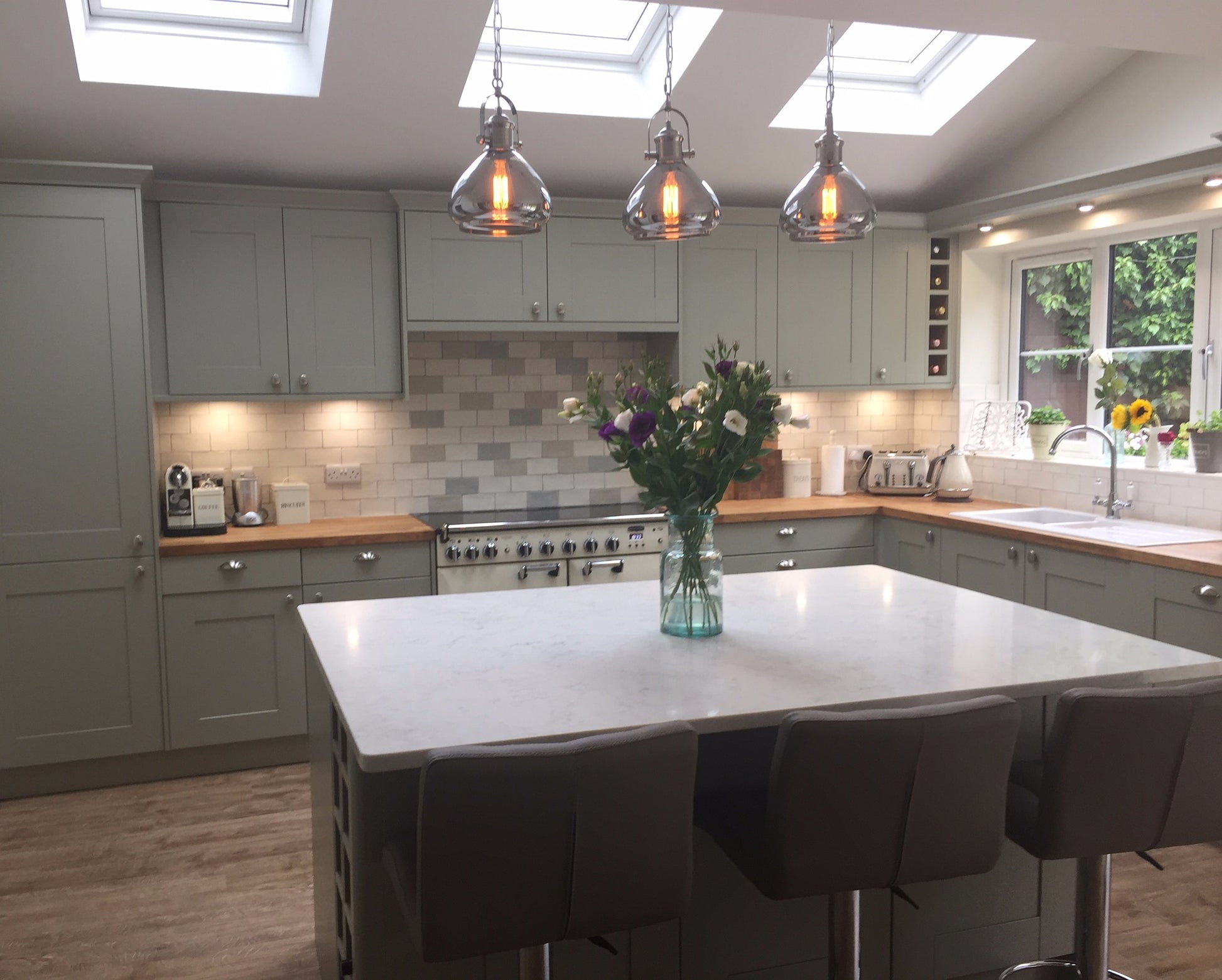 Family of pretty glass pendants that are perfect for contemporary and classic kitchen islands in a variety of shapes, all hung from matching chain, which is good for both aesthetics and sloped ceilings.