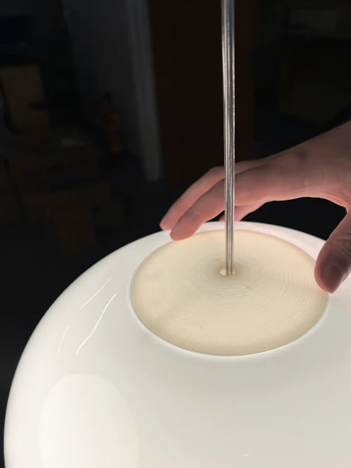 Beautiful, delicate white sphere pendants with a difference. The glossy glass reflects the natural environment (most glass spheres are matte); the shape of each size is ever so slightly different, making it natural and handmade and the hardware is practically invisible - the top is integrated into the design so seamlessly that it even glows with the glass when lit.