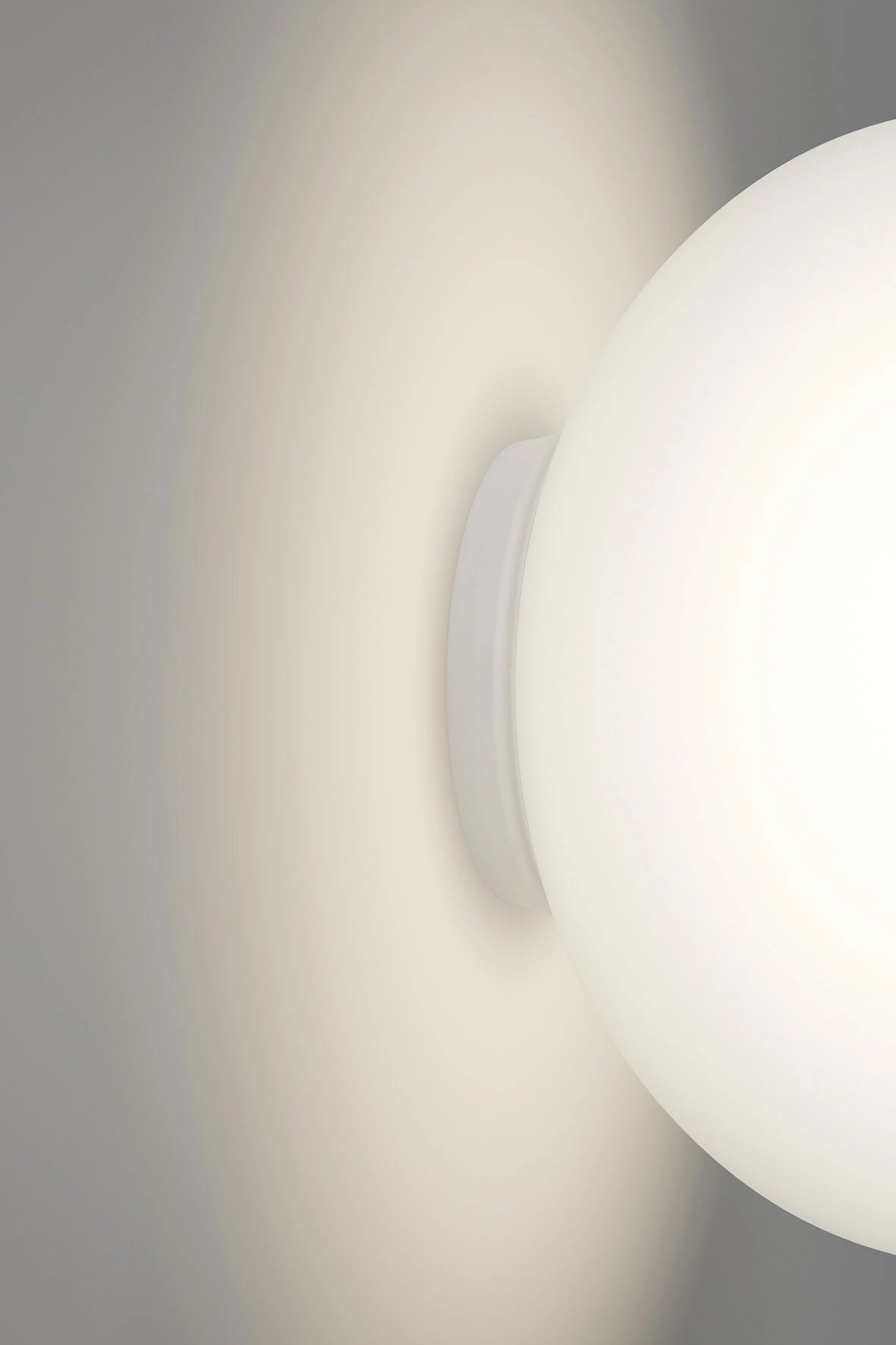 Petite white glass sphere wall light. Works great as an accent light on its own or in multiples for a bigger impact. Handblown white glossy glass with slightly organic shapes that add craftsmanship and design style.